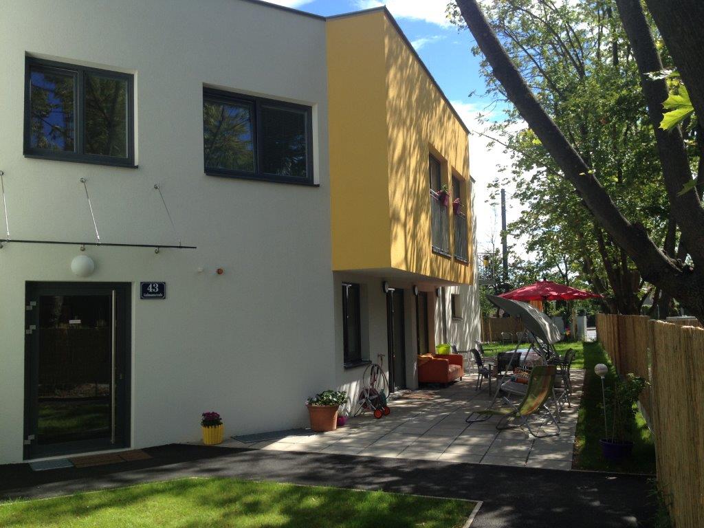 In einem 2013/2014 neu errichteten schönen Haus finden neun Menschen mit intellektueller und mehrfacher Behinderung ein neues Zuhause. Mit großen Einzelzimmern auf zwei Stockwerken aufgeteilt, sowie behindertengerechten Sanitärräumen und einem Pflegebad ist das Haus ausgestattet. Natürlich kann man auch vom unteren Wohnzimmer/Küche barrierefrei auf die Terrasse bzw. in den Garten gelangen. Zwei Bushaltestellen, 8A und 63A, liegen direkt gegenüber der Wohngemeinschaft.